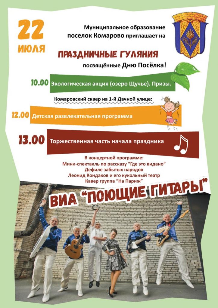 Праздничные гуляния, посвящённые Дню Посёлка Комарово – 22 июля 19 Июл 2017 Уважаемые жители посёлка Комарово! Приглашаем Вас на праздник, посвящённый Дню Посёлка! В программе – экологическая акция, детская программа и праздничный концерт с участием ВИА “Поющие гитары”