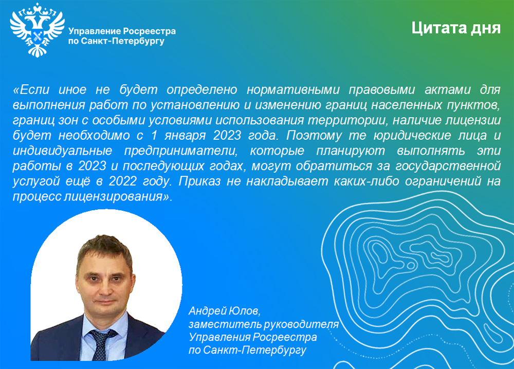 «Если иное не будет определено нормативными правовыми актами для выполнения работ по установлению и изменению границ населенных пунктов, границ зон с особыми условиями использования территории, наличие лицензии будет необходимо с 1 января 2023 года. Поэтому те юридические лица и индивидуальные предприниматели, которые планируют выполнять эти работы в 2023 и последующих годах, могут обратиться за государственной услугой ещё в 2022 году. Приказ не накладывает каких-либо ограничений на процесс лицензирования».