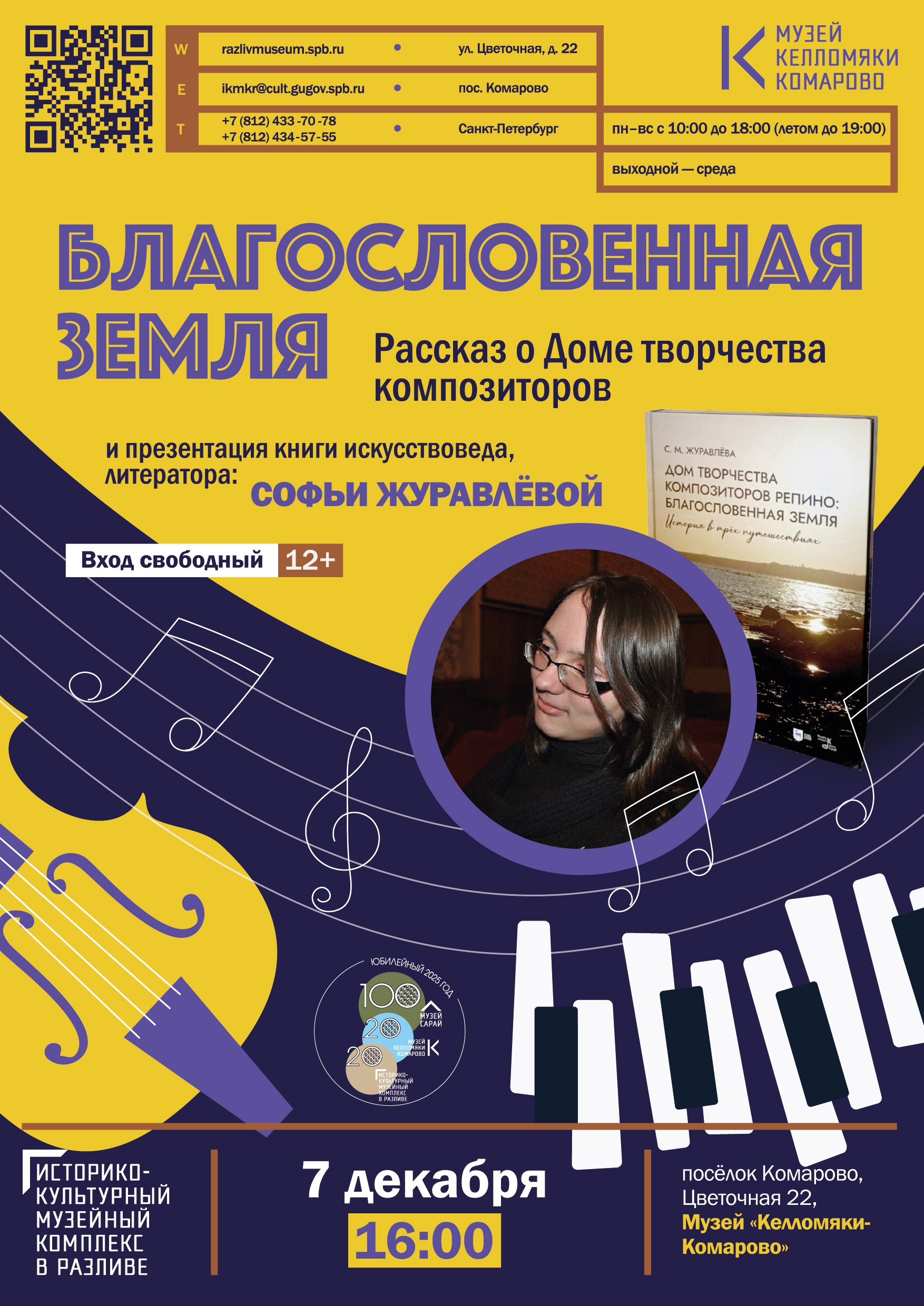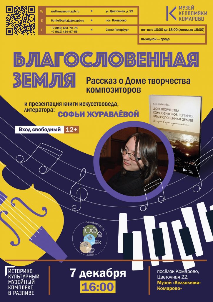 07 декабря 2025 года, в 16:00 музее «Келломяки-Комарово» состояится презентация книги искусствоведа Софьи Журавлевой «Дом творчества композиторов Репино: Благословенная земля».