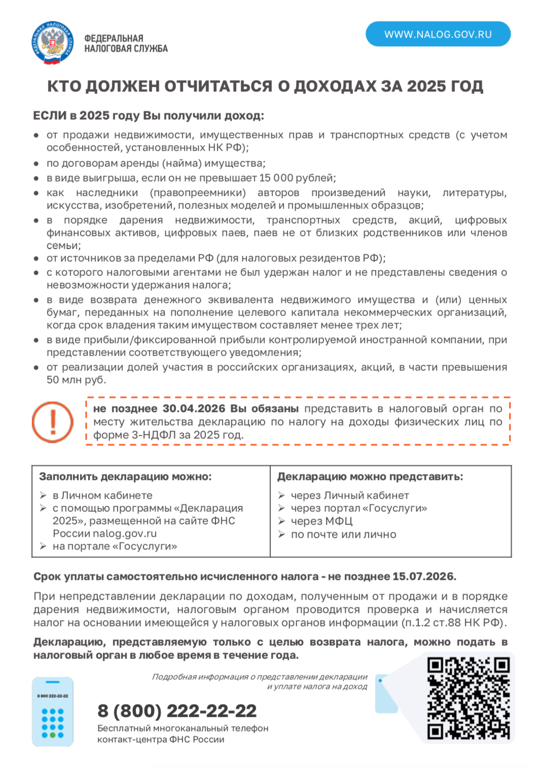 Кто должен отчитаться о доходах за 2025 г. 10 Фев 2026 Уважаемые Петербуржцы! Управление Федеральной налоговой службы России по Санкт-Петербургу напоминает: срок представления декларации (для обязанных лиц) по форме 3-НДФЛ за 2025 год – не позднее 30.04.2026;срок уплаты НДФЛ – не позднее 15.07.2026. Подробнее: www.nalog.gov.ru.