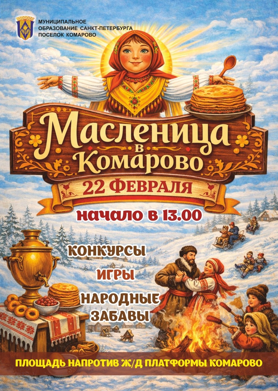Масленица в Комарово 20 Фев 2026 Уважаемые жители поселка Комарово! Приглашаем 22 февраля на праздничное мероприятие, посвященное проводам зимы. Праздник состоится напротив ж/д «Комарово». В программе: конкурсы, игры, народные забавы.