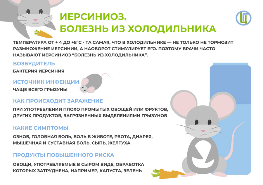 Иерсиниоз – острое инфекционное заболевание, характеризующееся поражением желудочно-кишечного тракта, общей интоксикацией, нередко кожными проявлениями, поражением печени, селезенки, суставов и других органов и систем. Источником инфекции могут быть дикие и домашние животные, но чаще всего — мыши. Они часто живут в овощехранилищах, где обсеменяют овощи возбудителями болезни. А низкая температура и высокая влажность — идеальные условия для размножения иерсинии. Иерсинии вообще не любители тепла – нагревание до 60ºC убивает их уже через полминуты, зато любой холод им нипочем – микроб выдерживает многократное замораживание и оттаивание.