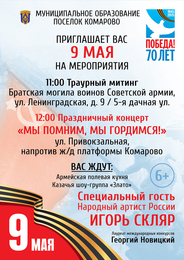 День Победы: празднование 9 мая 2015 в Комарово 6 Май 2015 Муниципальное образование поселок Комарово приглашает вас на мероприятия: 11:00 Митинг (ул. Ленинградская, д. 9 / 5-я дачная ул.) 12:00 Праздничный концерт (ул. Привокзальная)