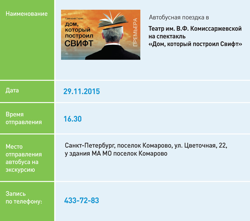 29.11.2015 состоится автобусная поездка в Театр им. В. Ф. Комиссаржевской на спектакль по пьесе Григория Горина «Дом, который построил Свифт».