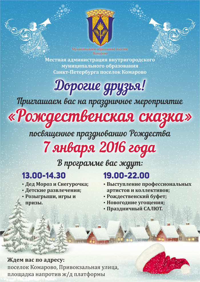Праздничное мероприятие «Рождественская сказка», 7 января 2016 г. 29 Дек 2015 Ждем вас по адресу: поселок Комарово, Привокзальная улица, площадка напротив ж/д платформы.