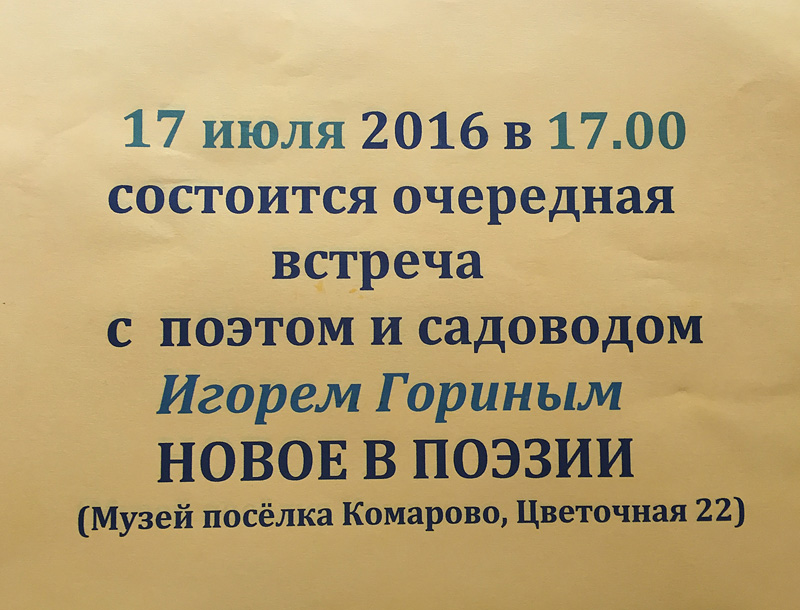 Встреча с поэтом и садоводом Игорем Гориным – 17 июля 14 Июл 2016 Уважаемые жители! 17 июля в 17 часов в помещении МУЗЕЯ поселка Комарово (Цветочная 22) состоится встреча с жителем Комарово Игорем Гориным.