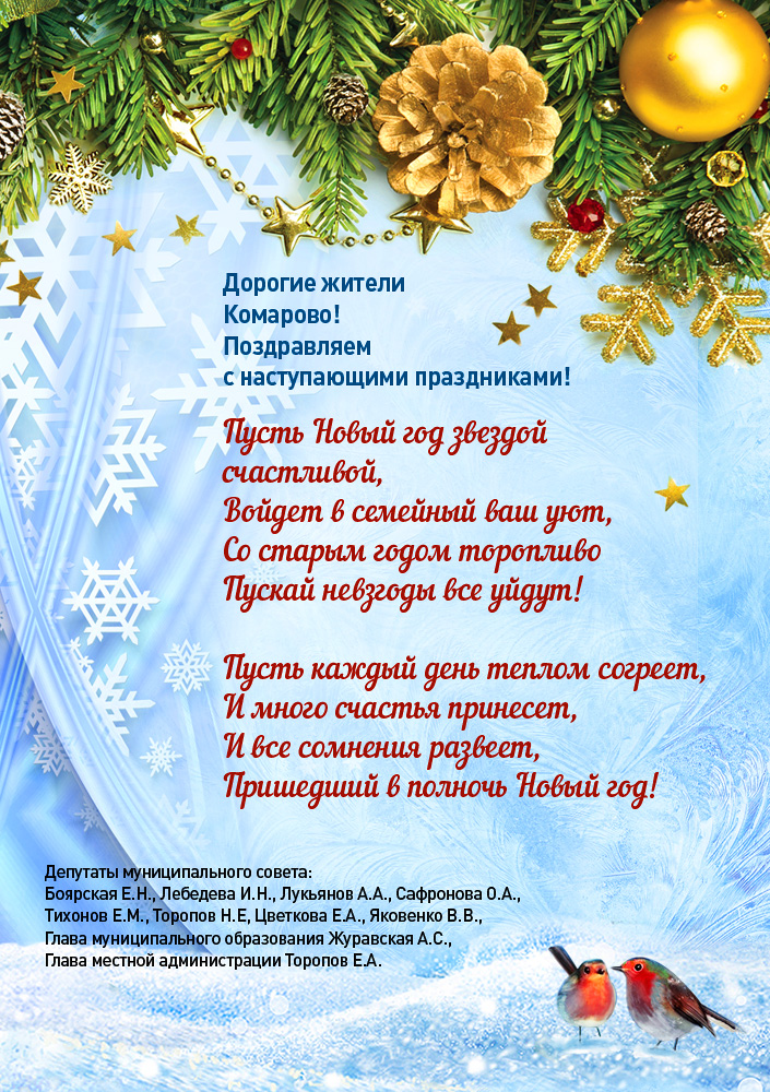 С Новым Годом и Рождеством! 22 Дек 2016 Дорогие жители поселка Комарово! Поздравляем с наступающими праздниками!