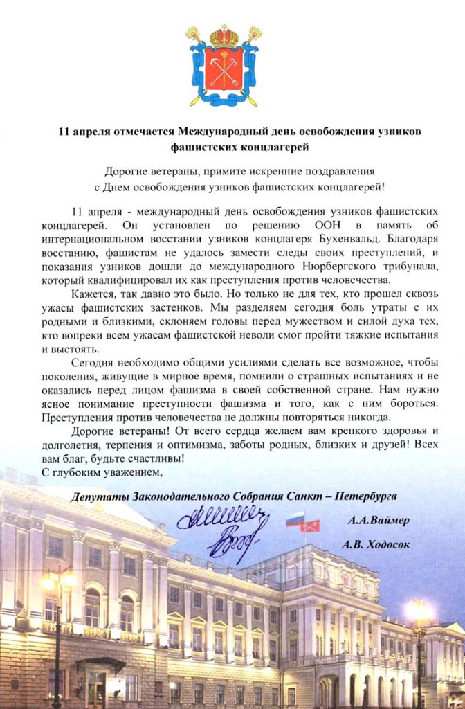 11 апреля – день памяти узников концлагерей 11 Апр 2017 Сердечно поздравляем Носову Валентину Павловну и Муратова Александра Александровича, желаем крепкого здоровья и благополучия! Глава МО пос. Комарово Журавская А.С. Глава МАМО Торопов Е.А.